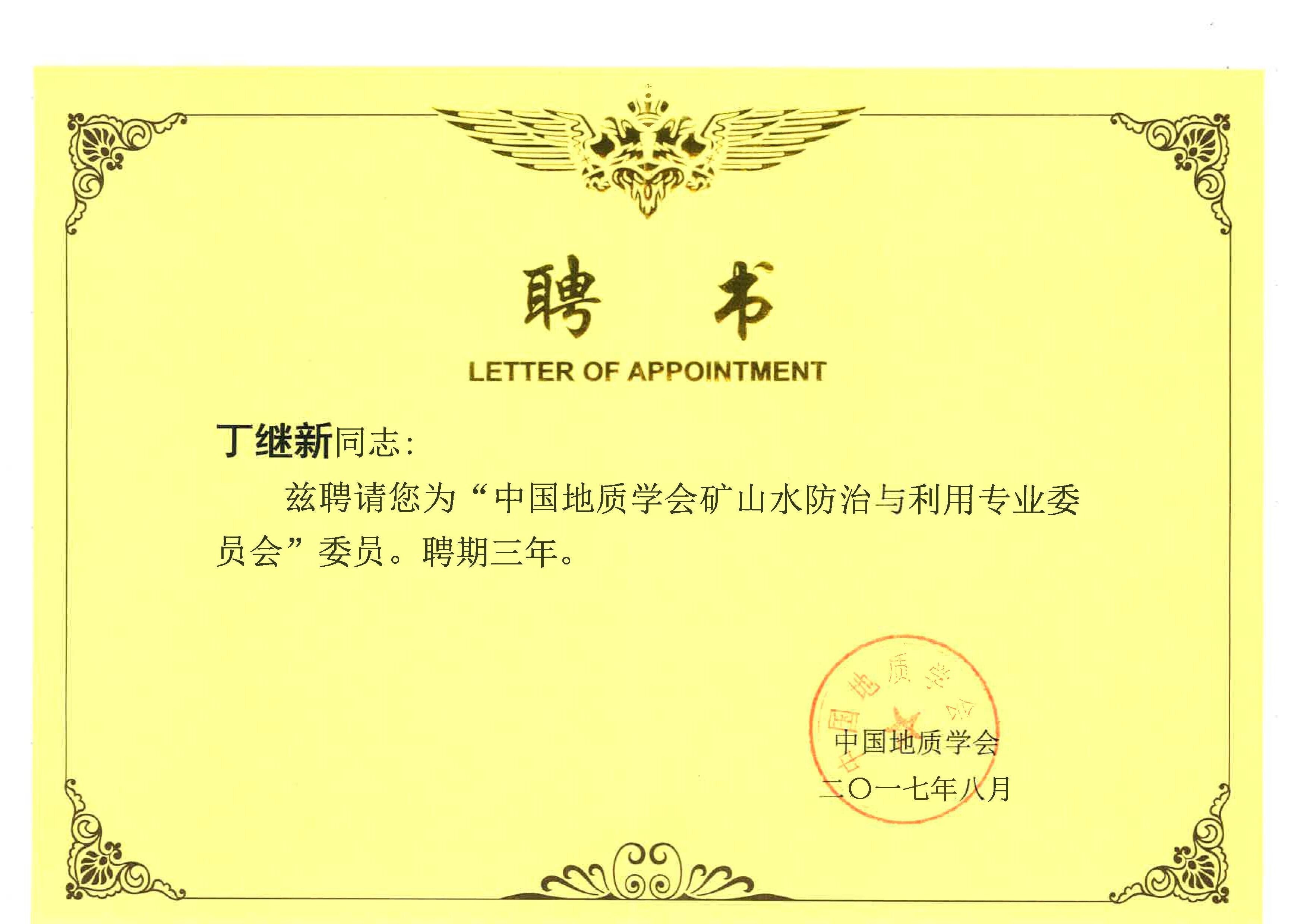 2017年10月23日,我公司总经理丁继新接到中国地质学会聘书,被聘为“中国地质学会矿山水防治与利用专业委员会”委员,该项殊荣一方面彰显了丁继新总经理在专业领域的突出业务水平和卓越的成绩,同时也为我公司在行业领域贡献社会责任提供了渠道和机会。